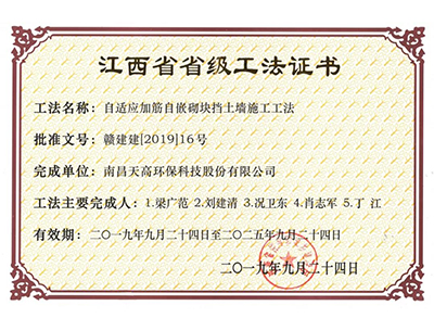 近日,江西省住房与建设局公布2019年度第一批省级工程建设工法名单,南昌天高环保科技股份有限公司申报的《自适应加筋自嵌砌块挡土墙施工工法》,通过工法认证委员会全面、严格的工法审查,成功获得省级工法证书。